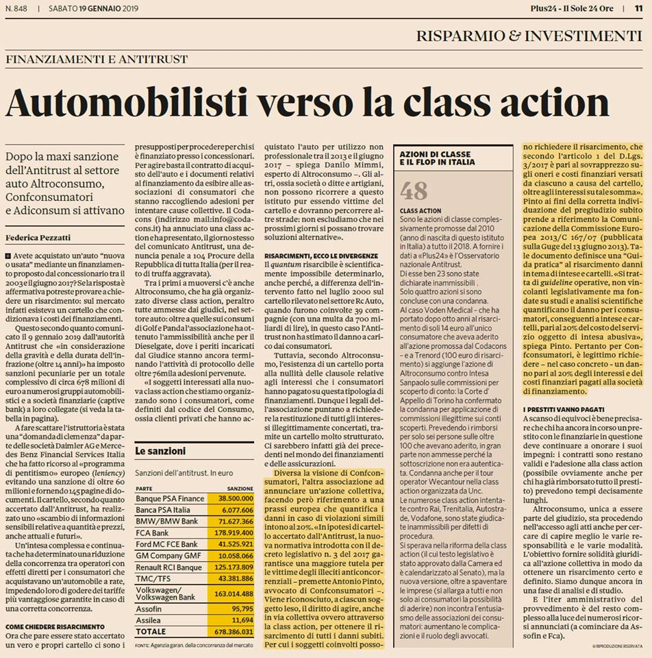 Intervista sul Sole 24 Ore ad Antonio Pinto, presidente regionale di Confconsumatori, per descrivere le pesanti sanzioni dell'Antitrust alle tante società finanziarie che hanno fatto cartello e le ragioni giuridiche dei cittadini che hanno comprato un auto, avvalendosi di queste finanziarie. Gli avv. Antonio Amendola e Rossana Lopedote hanno collaborato allo studio della vicenda.