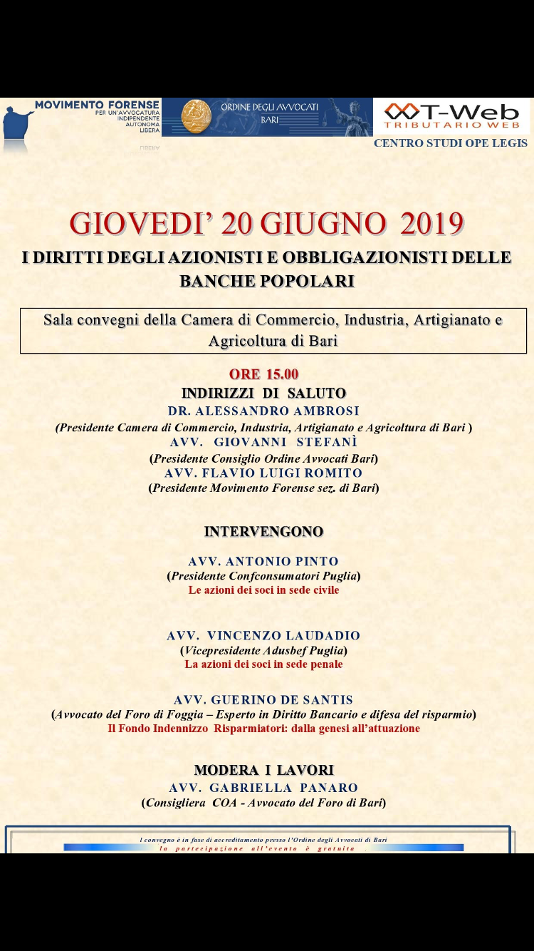L’Ordine degli Avvocati di Bari ha organizzato incontro di studio sui diritti degli azionisti e obbligazionisti delle banche popolari. Antonio Pinto sarà uno dei relatori. Il giorno 20 giugno alle ore 15, presso la Camera di commercio di Bari. L'incontro è pubblico ed i professionisti partecipanti riceveranno tre crediti formativi.