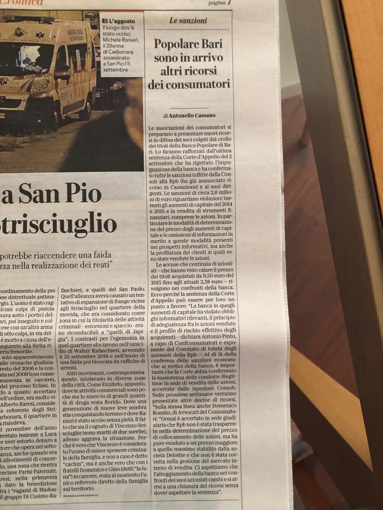 La Corte di Appello di Bari, con sentenza ampiamente motivata, la scorsa settimana ha rigettato l’opposizione della banca ed ha confermato tutte le sanzioni inflitte dalla Consob alla BPB ed ai suoi dirigenti. Tale sentenza, in concreto rafforza le ragioni giuridiche degli azionisti, perché rimane autorevolmente confermato che la banca nei tre aumenti di capitale svolti fra fine 2012 ed il 2015, ha violato obblighi informativi rilevanti, il principio di adeguatezza fra le azioni vendute e il profilo di rischio effettivo degli acquirenti, non ha garantito il corretto funzionamento del mercato di negoziazione interno delle azioni. Al di là della conferma delle sanzioni economiche ai vertici della banca, è importante che la Corte abbia confermato la sussistenza delle condotte illegittime in sede di vendita delle azioni, accertate dalle ispezioni Consob anche grazie ai tanti esposti proposti da azionisti assistiti giuridicamente dal Comitato per la tutela degli azionisti BPB.