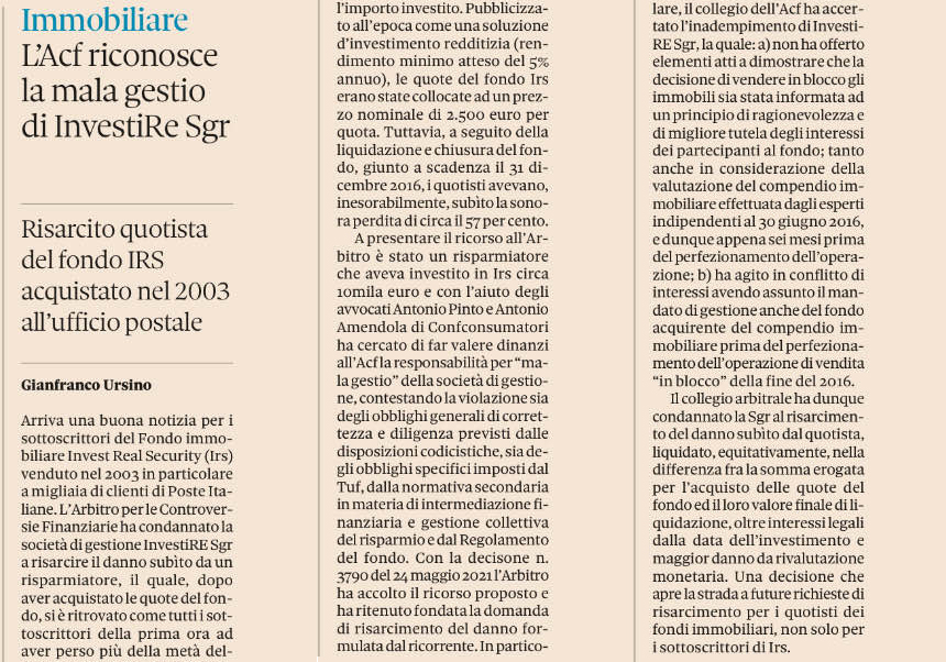 Il Sole 24Ore riporta la vittoria che Antonio Pinto e Antonio Amendola hanno ottenuto nei confronti della Investire SGR.