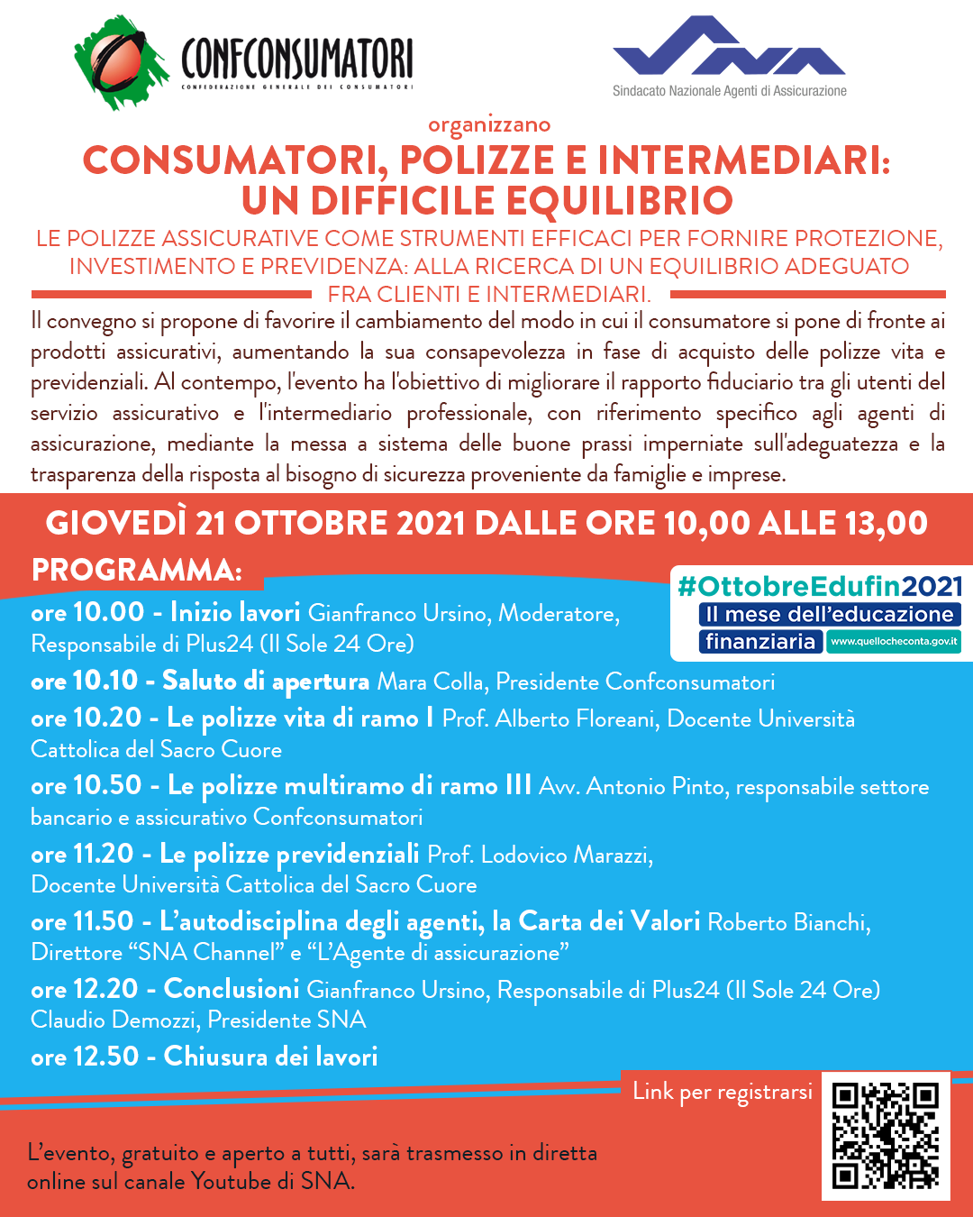 21/10/21 Antonio Pinto relatore a Milano sul tema delle polizze assicurative multiramo, con sottostante prodotti finanziari. Webinar organizzato da Conconsumatori e Sindacato Nazionale Agenti per il mese dell'Educazione finanziaria.