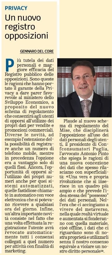 Intevista ad Antonio Pinto sul nuovo registro delle opposizioni al telemarketing.