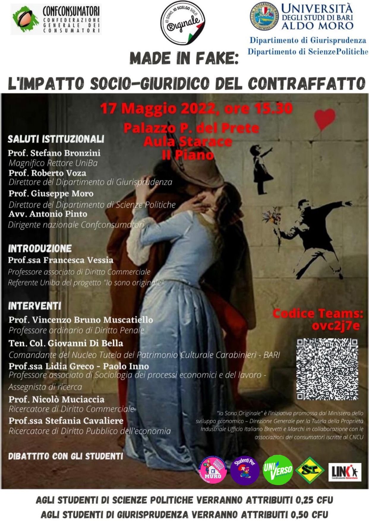 Antonio Pinto terrà un intervento presso l'Università di Bari per presentare un progetto contro la contraffazione dei prodotti, realizzato dall'Università di Bari e da Confconsumatori, patrocinato dal Ministero dello Sviluppo Economico.