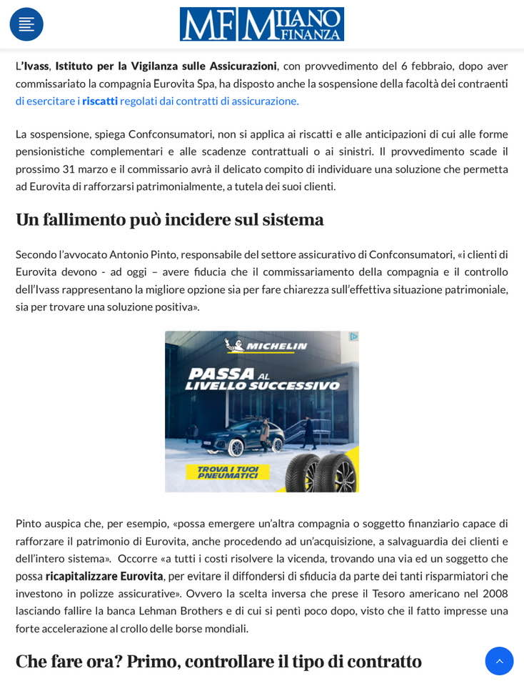 L'intervista di Antonio Pinto su Milano Finanza sulla vicenda del commissariamento della Compagnia di assicurazioni Eurovita
