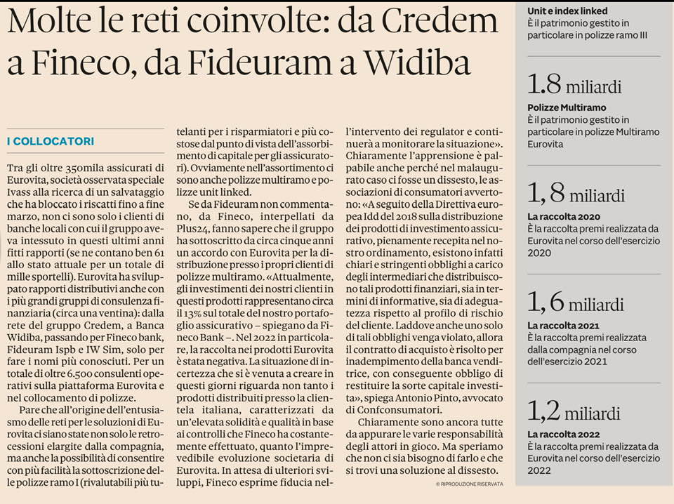 Antonio Pinto intervistato dal Sole24Ore sulla vicenda del commissariamento della Compagnia di assicurazioni Eurovita.