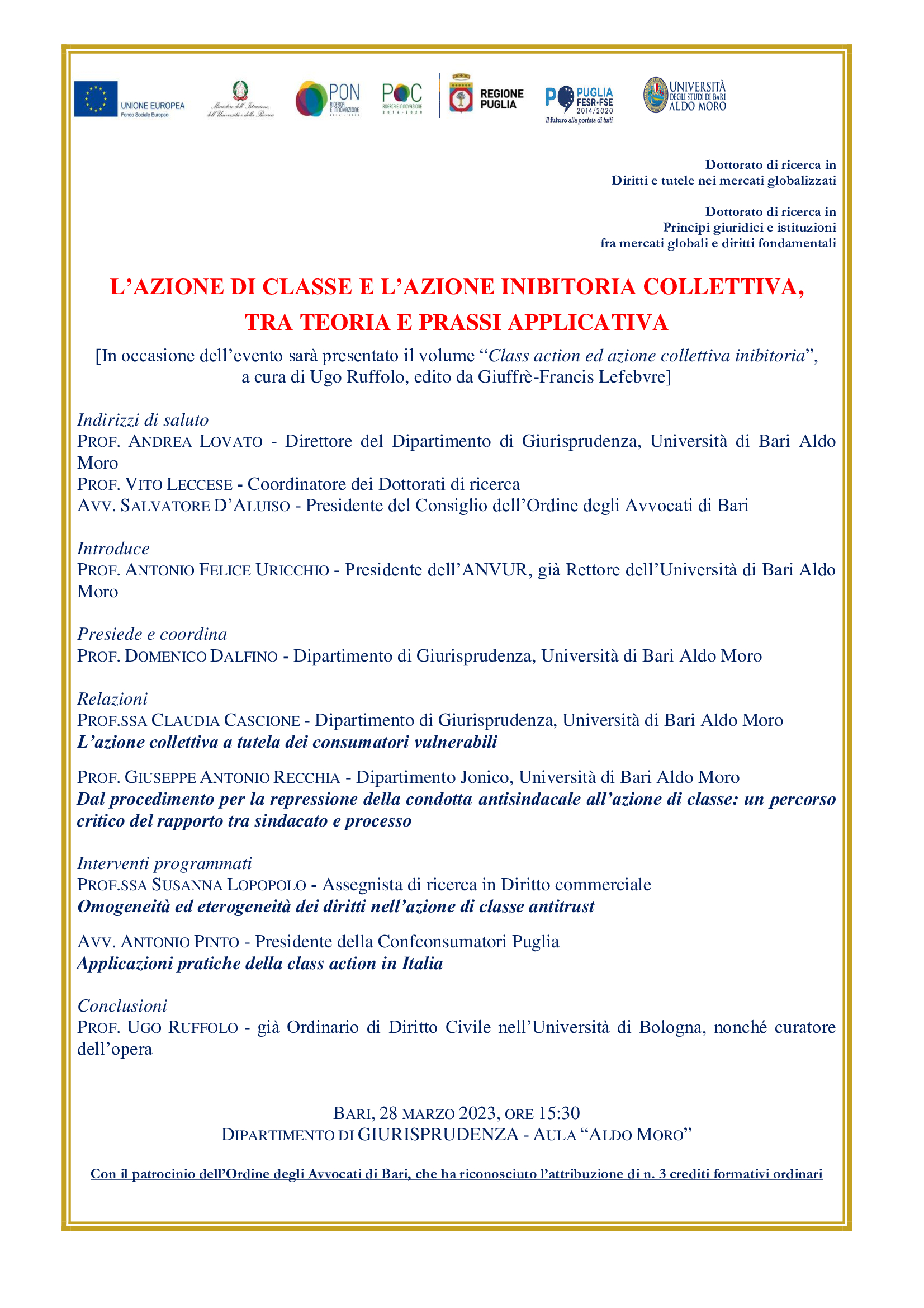 Antonio Pinto relatore al Convegno organizzato dall'Università di Bari - Dipartimento di Giurisprudenza sul tema della Class Action: L'azione di classe e l'azione inibitoria collettiva, tra teoria e prassi apllicativa. L'intervento di Antonio Pinto sulle applicazioni pratiche della Class Action in Italia.
