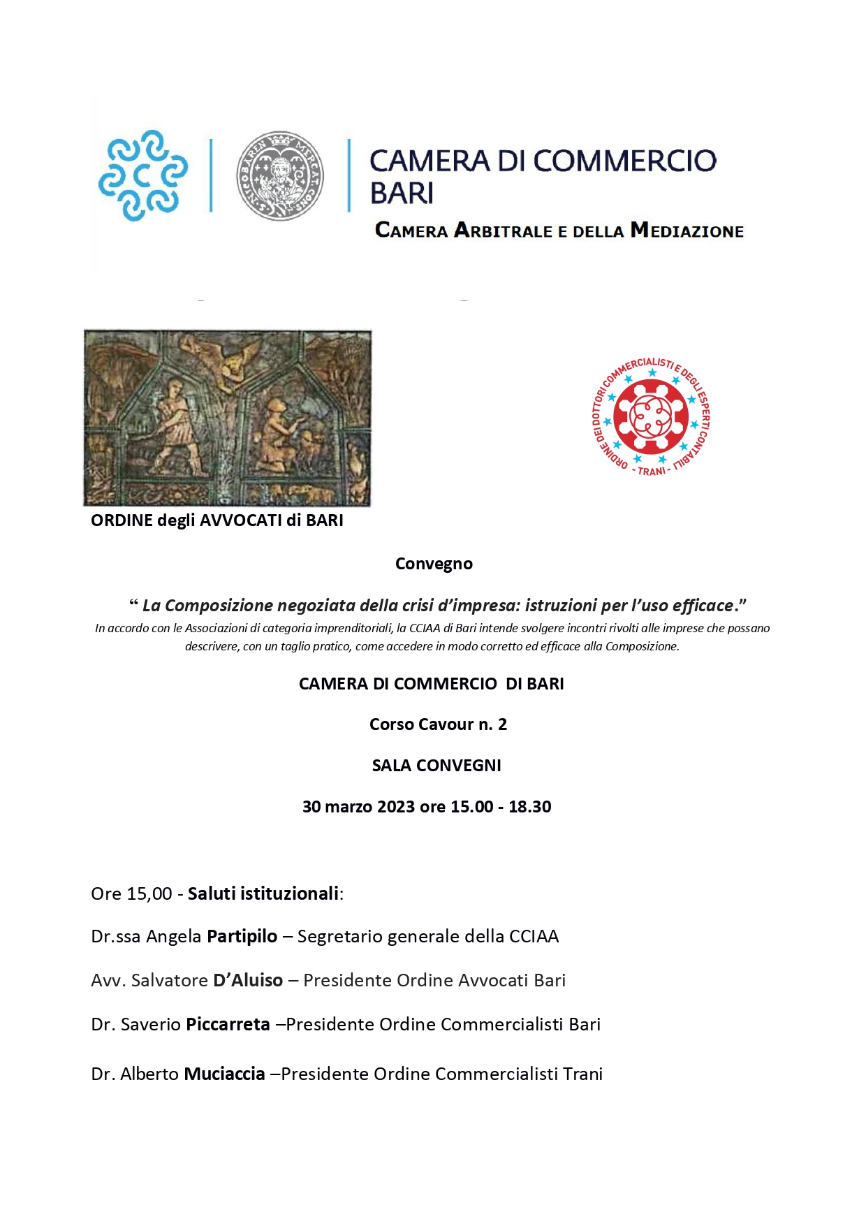 Alberto Sgaramella e Antonio Pinto relatori ad un convegno organizzato dalla Camera di Commercio di Bari sul tema: “La composizione negoziata della crisi di impresa: istruzioni per l’uso efficace”